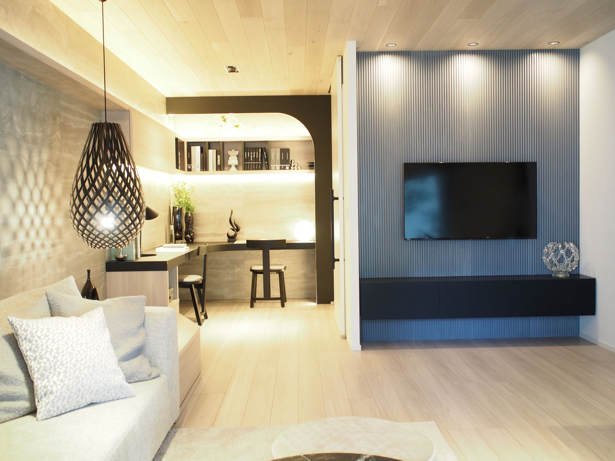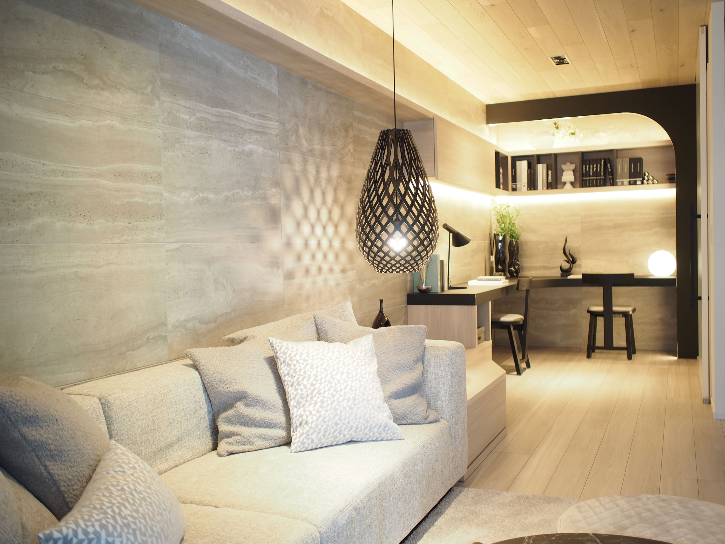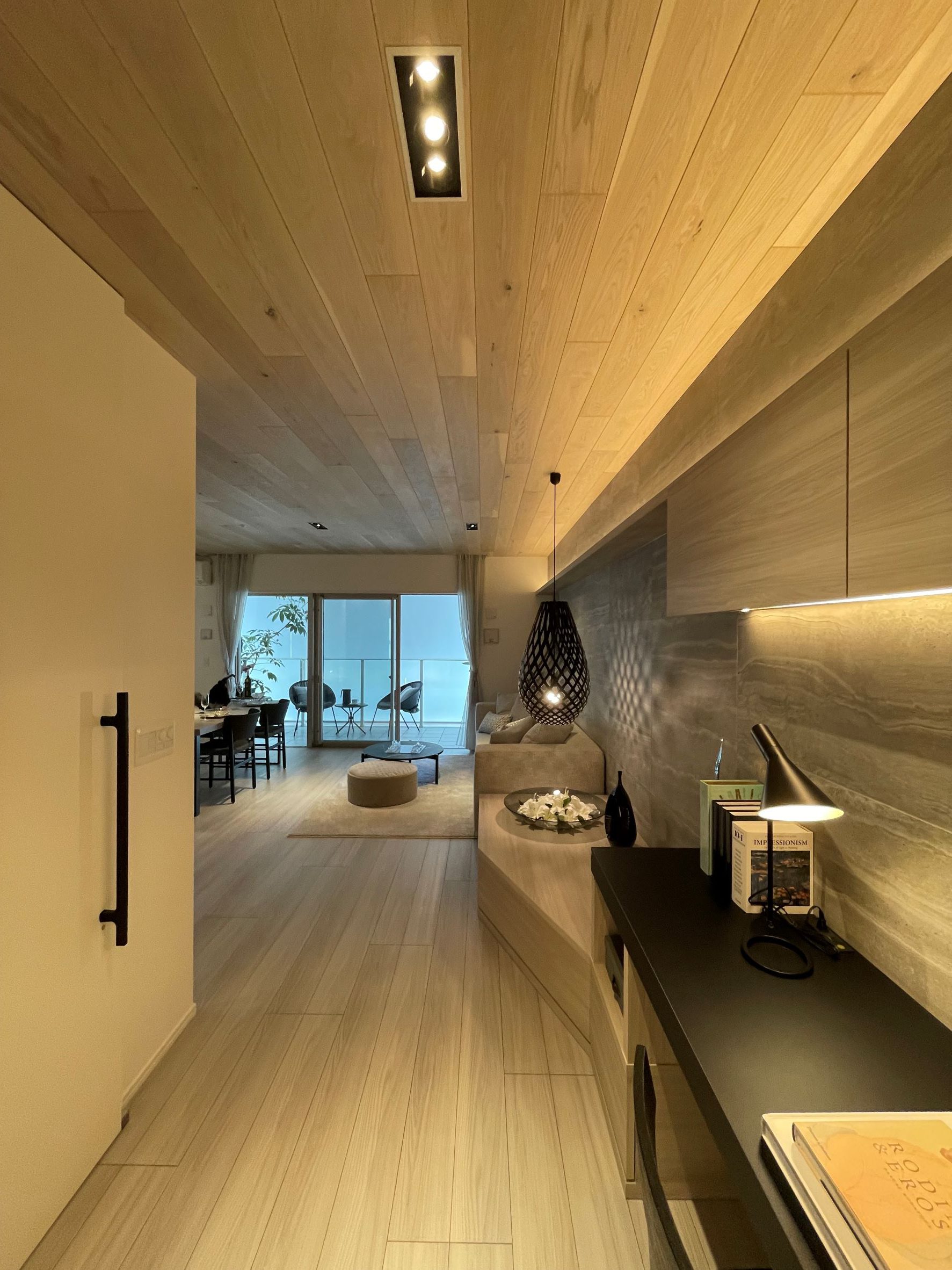 and the light and shadow cast by the bamboo plywood pendant lamp illuminate the space with a dreamlike glow, like moonlight reflecting on a river's surface.