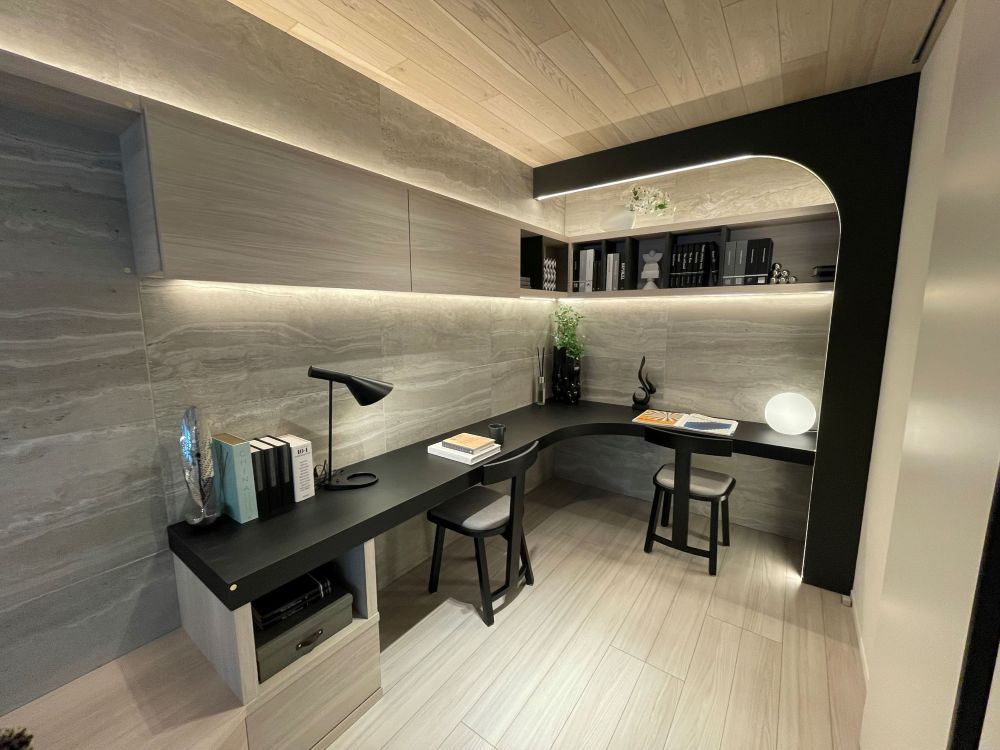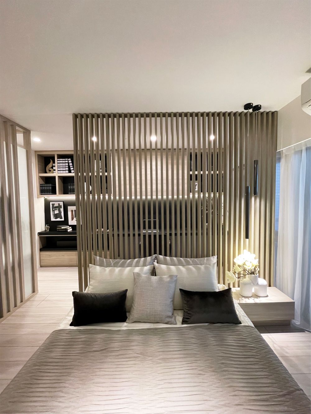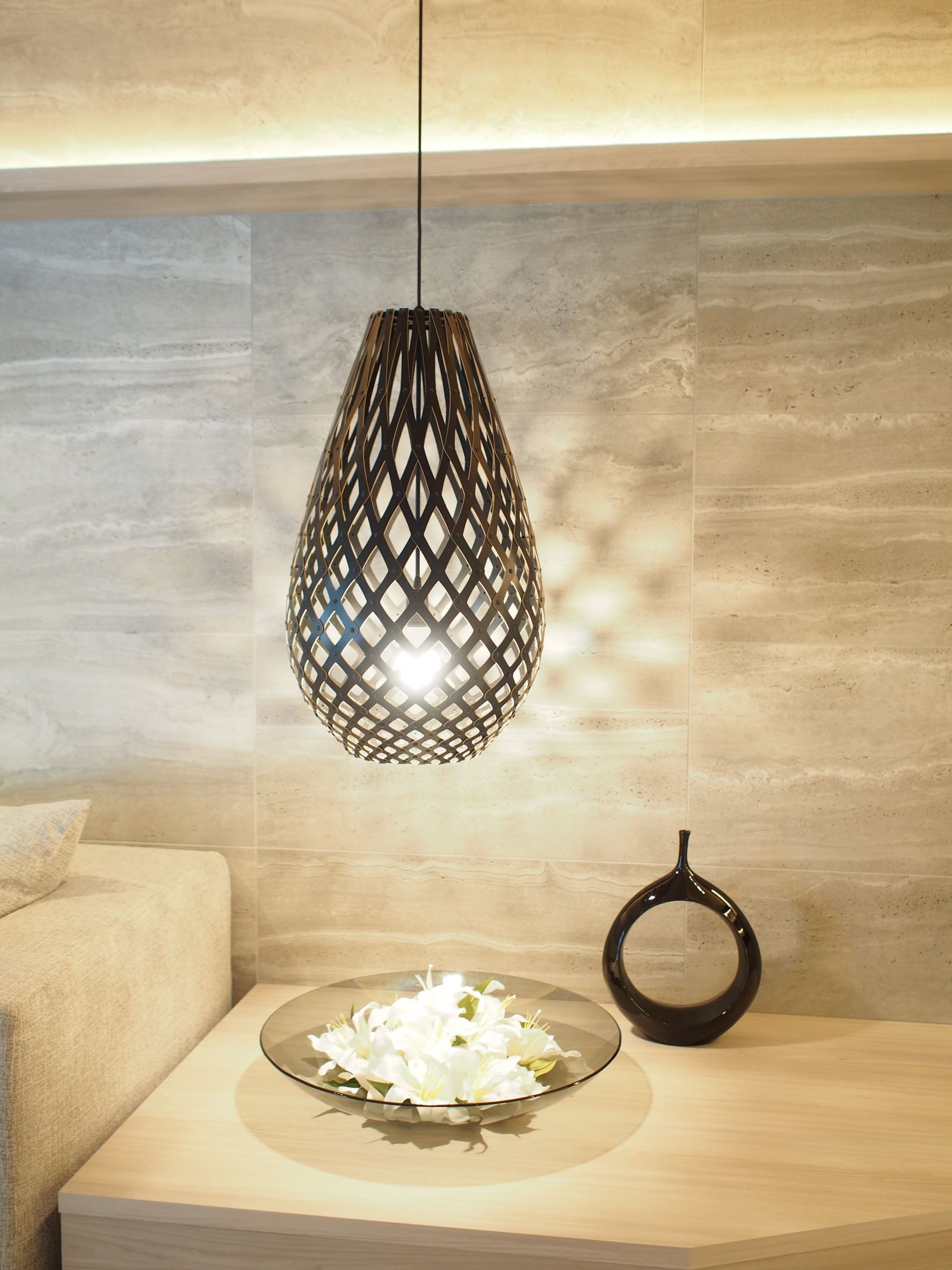 and the light and shadow cast by the bamboo plywood pendant lamp illuminate the space with a dreamlike glow, like moonlight reflecting on a river's surface.